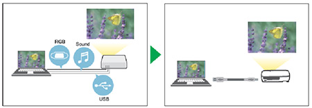 The built-in HDMI terminal provides an interface for transmitting high quality images and audio through an HDMI connection. Moreover, the USB Display function for Windows and Mac PC makes it possible to connect to a PC via a USB cable instead of an RGB cable.