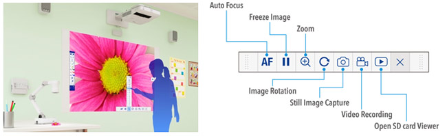 Connect the Epson ELPDC21 document camera to an EB-710Ui projector to easily capture and displays books, 3D objects and experiments. You can also add annotations directly to a projected live image without the need of a PC. To simplify the process you can operate the document camera from the toolbar on the projection screen.