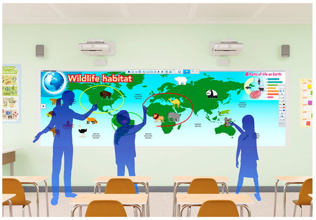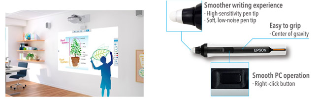 Use your fingers to annotate directly onto the screen. Epson's interactive pens are now even more responsive and easy to use. With the new dual pens, teacher and student or two students can work simultaneously using different attributes.