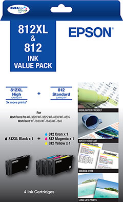 1 x 812XL Black ink cartridge + 3 x 812 Std colours ink cartridges - Cyan, Magenta, Yellow."