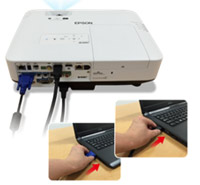 The projector starts automatically upon connecting a VGA*, HDMI**, or USB cable to the device itself. This feature means you no longer have to use the power on button because startup is activated with cable insertion.